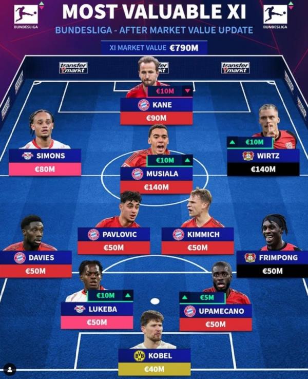 11月2日讯 德国转会市场列出了进攻型中场身价排名,贝林厄姆1.8亿欧居首,穆西亚拉1.4亿欧次席。进攻型中场德转身价排名:贝林厄姆(皇马)——1.8亿欧穆西亚拉(拜仁